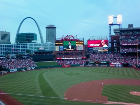 We walked to Busch Stadium on Friday evening for the Cardinals vs. Braves game. When I bought the tickets I had no idea that the Cardinals would be retiring Tony La Russa’s number (#10) in a pre-game ceremony. Bonus! It was a fitting honor for La Russa, who had managed the Cards for 16 years and led them to two World Series titles, in addition to many other notable achievements. An incredible group of baseball greats (including Lou Brock, Tom Seaver, Bob Gibson, Dennis Eckersley, Dave Stewart, Mark McGwire, and Joe Torre) was seated with him in front of home plate, and La Russa’s speech was filled with humility and appreciation. The home crowd also showed a lot of class that night in giving the Braves’ Chipper Jones a standing ovation when he was introduced. Jones, playing in his farewell season, was similarly cheered before each at bat in recognition of his stellar career.